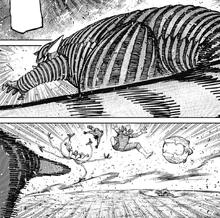 Banga used the gigantification function of the exosuit to save Bamora from a Big Mama and fight alongside the enslaved Sumerians against the Kur to reach the Sumer's transportation pyramid. | ||