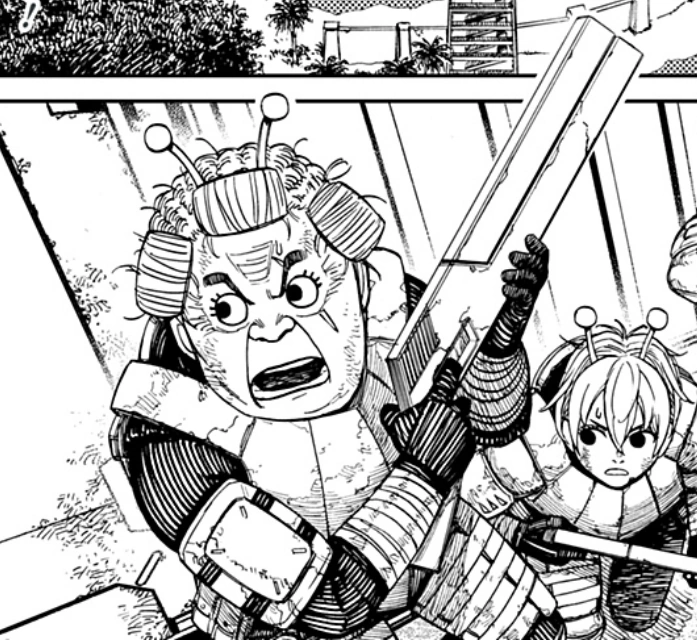 Bamora grows up with the three grannies and gets attached to Banga who she considers her mother. She gets mad but the kid ignores her. Tome and Aja consider Bamora the child of all the sumerians, which ticks off Banga even more. Their regiment is informed by scouts that more than three thousand sumerians are still alive and they venture to the West, with Banga forcing Bamora to stay at the center of the formation for better protection. In the middle of the jungle they stumble upon the Kur feeding the Big Mama with other sumerians, who Banga explains to the kid that the aliens are physically weak and make use of the exosuits the Mama produces for them. The God of Sumer exosuit gets crafted, which she calls the very embodiment of sumerian hate. She forces Bamora to leave the captive people behind and proceed towards the rendezvuos point.