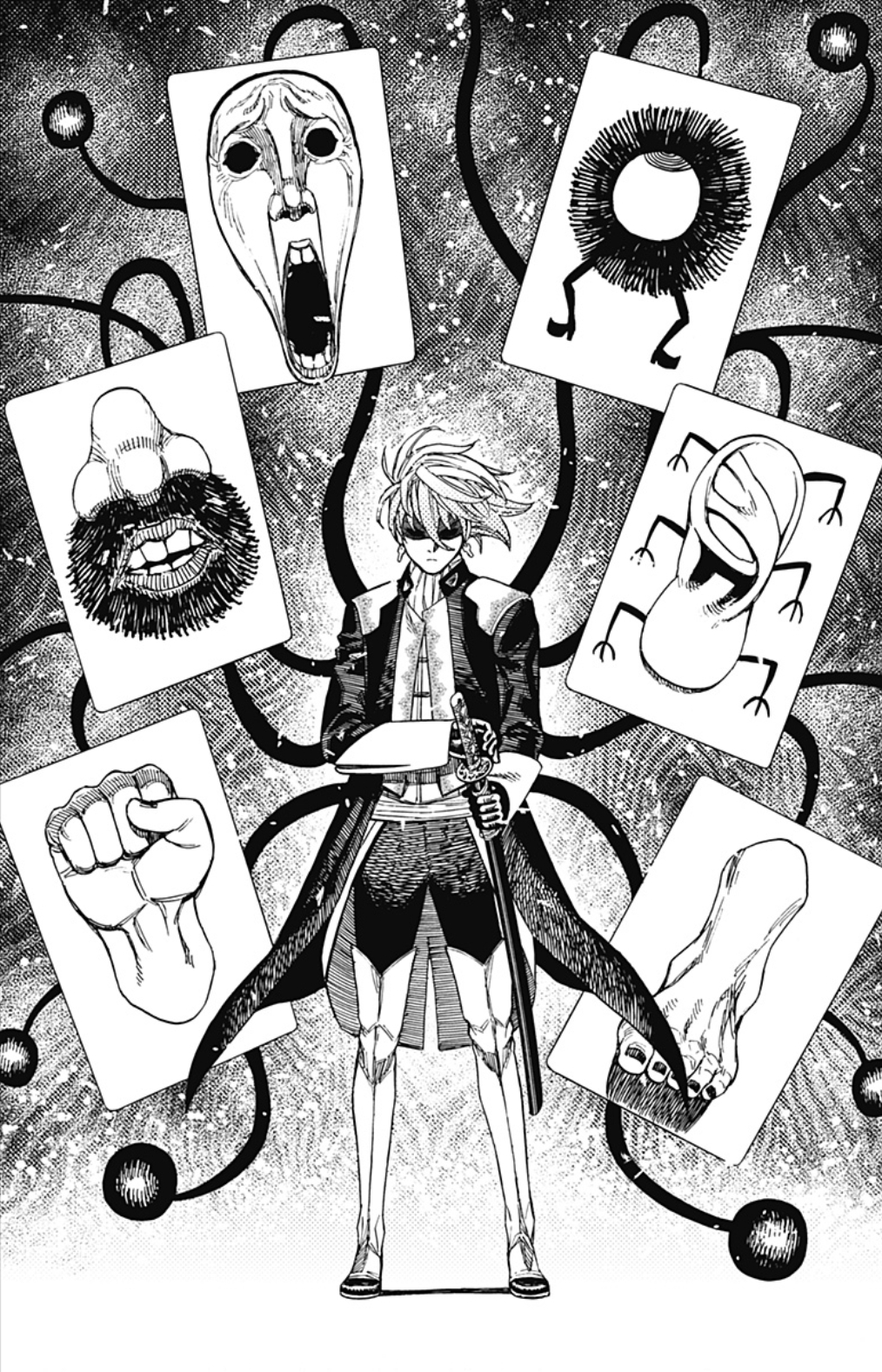 Contrary to the original powers of the Fairy-Tale Card, the Asura includes two additional cards: one illustrating a fist and another a foot. The specific applications of body manipulation from these cards remain unknown. |