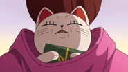The Evil Eye is insisted by Momo to swap consciousness with Jiji but refuses. Their dispute is interrupted when nearby girls misinterpret their quarrel as flirtatious banter, much to Momo's denial. The Evil Eye's attention then becomes drawn towards the soccer ball being played by the school's soccer team, prompting him to rush towards the field to kick their ball, thinking it is his grudge ball. Momo runs after him, while the team mistakenly believes his excitement indicates he is joining the team. With the vending machines out of hot beverages, Momo resolves to keep a vigilant watch on the Evil Eye throughout the school day. In class, he scribbles furiously and makes loud outbursts, catching the teacher's attention. During lunch, Momo attempts to bring Jiji back with hot food, only to discover that everything is sold out except for cold noodles. She then tries to show him how to use chopsticks to eat his food, only for him to stubbornly throw the chopsticks, after finding them hard to use, and eat with his hands.