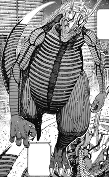 Later, Hastur and his team confront Okarun to acquire his kintama that they plan to use as a battery to summon their main force. Using his suit's spatial carving ability, Hastur deals a devastating blow to Okarun that results in him losing conscious. With the kintama acquired, Hastur and his team prepare to leave the area through a portal and decide to also take Okarun with them to perform an investigation on his internal anatomy. However, their exit is interrupted by Mr. Mantis Shrimp who arrives to save Okarun. Hastur stops the Jet Booster Exosuit Kur from fighting him, telling his teammate that they don't have the time, and leaves with his team without Okarun in their possession, but not before threatening to target Mr. Mantis Shrimp the next time they meet.