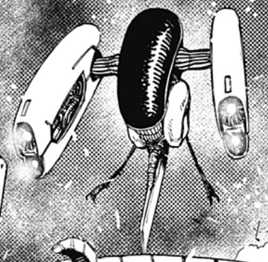 A small-size exosuit that, unlike most exosuits shown, lacked a full body and only possessed an elongated dome head with no eyes and a toothed mouth head that acted as the cockpit, which was a design that is quite similar to the Jet Booster Exosuit. The exosuit noticeably was equipped with a pair of firearms on its sides and included stick arms and a thin piece of metal at the bottom.