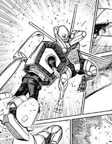 The alien lunges forward, unleashing a relentless flurry of kicks against Okarun's armor, forcing him to activate his boosters and collide into her. In a burst of fury, she opens her exosuit's faceplate and bites into his arm, drawing pain and prompting him to use his pile bunkers to force her off. It is then that Okarun catches a glimpse of her humanoid face, realizing with shock that she is not one of the Kurs. The alien dives again, landing a crushing kick that slams his hand into the nanoskin arm, disrupting the imagined steel properties crafted by Kinta. Using the hip-mounted mechanism on her suit, the alien supercharges it to attack Okarun with an enhanced kick that completely shatters his armor. Before she could gain a chance to attack him again, Hase stands in her way to stop her from taking away his opportunity to eliminate Okarun. The alien is then attacked by Hase, being sent skyward with a kick and then slammed down into the ground that leaves her vulnerable to Hase's devastatingly relentless jumps that damages her suit and renders her unable to continue fighting. After witnessing Hase's defeat by the boys, the alien picks herself up off the ground and retreats.