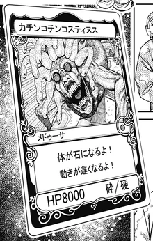 Medusa (メドゥーサ Medūsa?) is one of the three guardian deities in Danmara keeping the Fairy-Tale Card locked away. In accordance with the functionality of the dimension, her defeat leads to not only the yokai's seal being broken, but also players acquiring the Rock-hard Costinus (カチンコチンコスティヌス Katinkotinkosutinus?) card where they can utilize her skills.