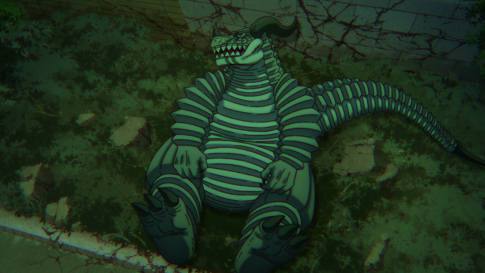When Bamora is launched out of the apartment due to Okarun going all-out, the heavy blow activates her exosuit's emergency defense system, overriding her controls. The kaiju enlargens, growing bigger even than the apartment complex itself. As it grows, it notices Momo, Okarun and Kinta inside the balcony and it smashes its head into the building to crush them. The trio is able to get out of the way and they head towards the exit in fear, finally realizing that they are trapped inside empty space and that they must be fighting a space kaiju. The monster keeps wrecking buildings in order to find them, but neither Momo nor Okarun know if it has a weak spot and they decide to flee outside. The kaiju spots them and crashes its way through the city to catch the trio.