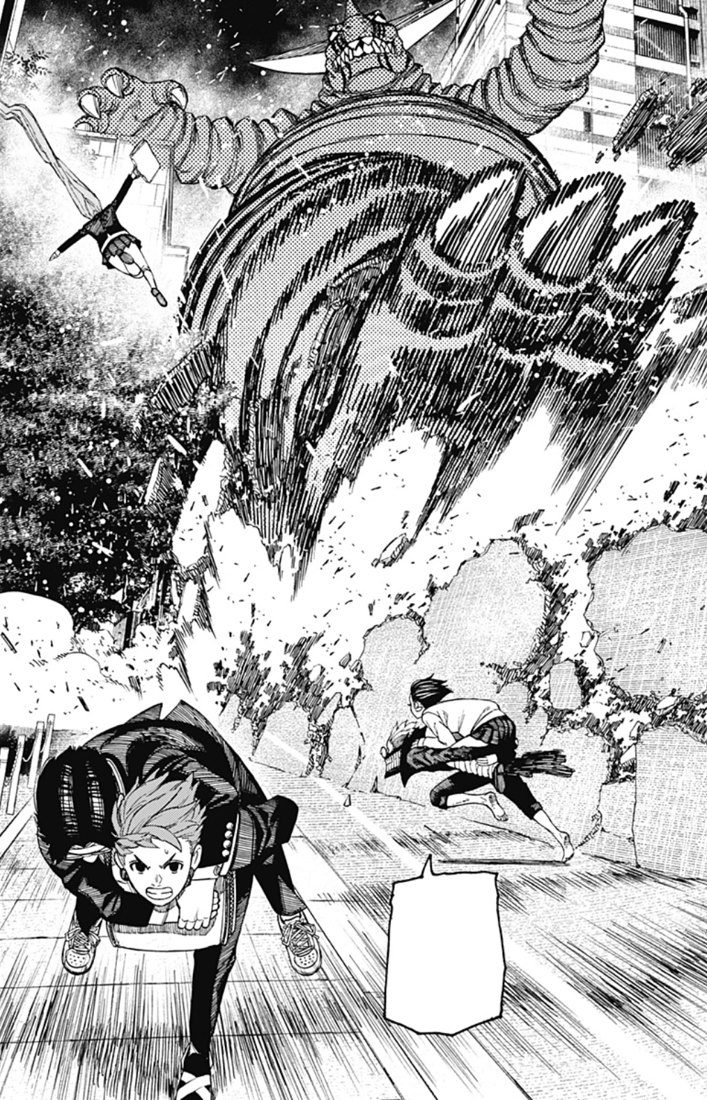 Still, when Momo launches a car at the kaiju's foot, instead of the monster throwing its leg towards them, it decides to sit down and whip its tail in their direction, barely missing them. And rather than Aira getting hit while she is distracted, she uses her hair as tendrils to hold herself in the air and catapult a crane at the target, striking it as she boasts to Momo on her amazing moves worth of a leader. Just then, the kaiju throws the crane back at her and she protects herself with her hair, although the creature doesn't stop there and catches her in its left hand, breaking her face mask by squeezing her tight. The kaiju opens its mouth to devour her but he's hit in the face by a billboard thrown by Momo. She keeps bombarding the monster with them and gives Aira the opportunity to escape, bursting her hair through its palm and dodging its hands which intended to catch her as she fell down. The leader points out that the billboards are barely doing any damage so the two girls bicker for a bit before Aira decides to jump down and lure the kaiju before slipping away. The monster tries to look for her in the nearby buildings with no avail, forcing it to wreck the entirety of its surroundings and causing massive damage. Inside the huge cloud of dust, the monster unexpectedly charges an electrical beam in Momo and Okarun's direction, generating a series of electrical arcs transmitting through the ground that catch the duo by surprise, flinging them backwards and bringing the boy out of his yokai form.