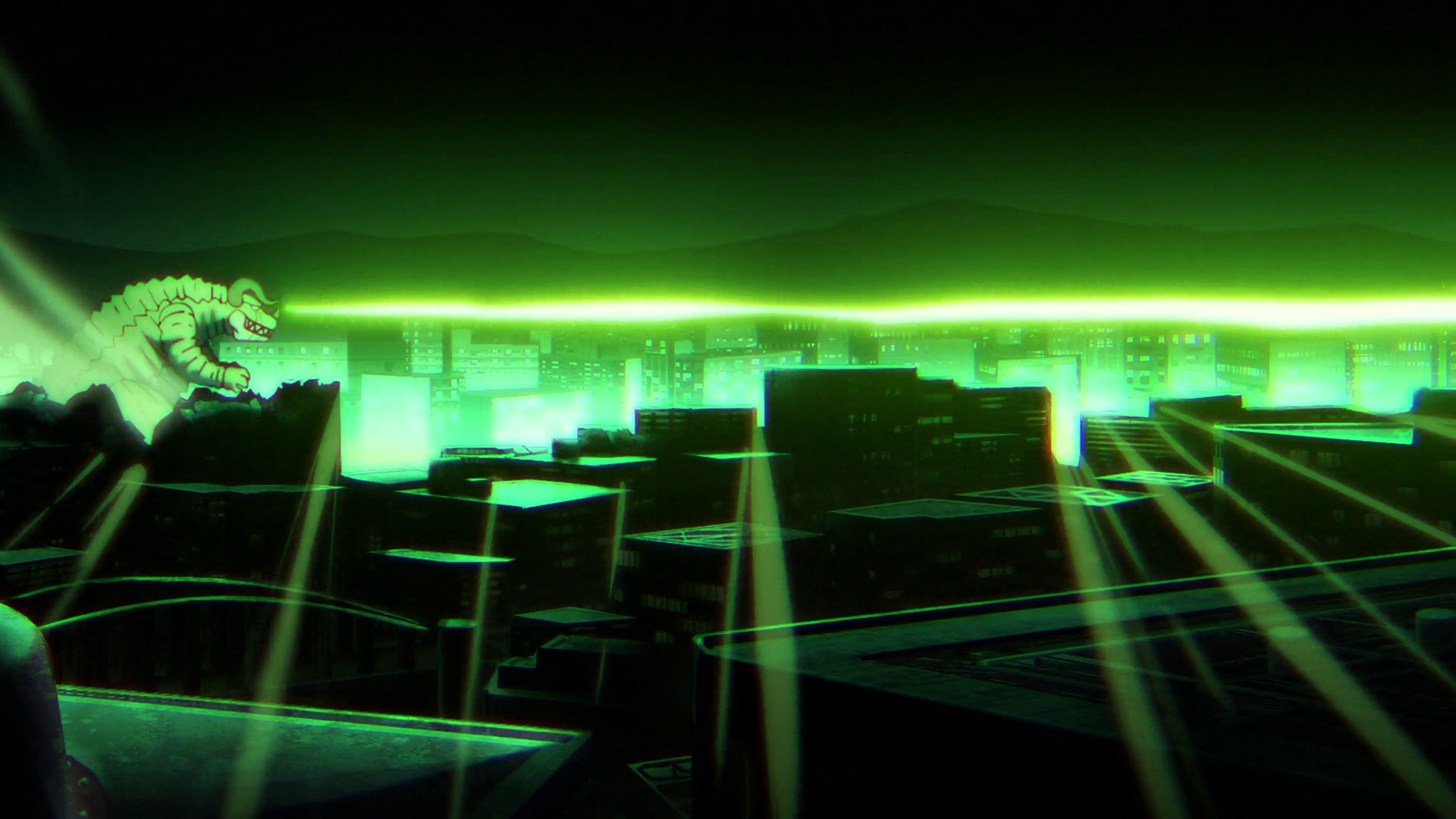 The kaiju unleashing a city-wide electrical beam.