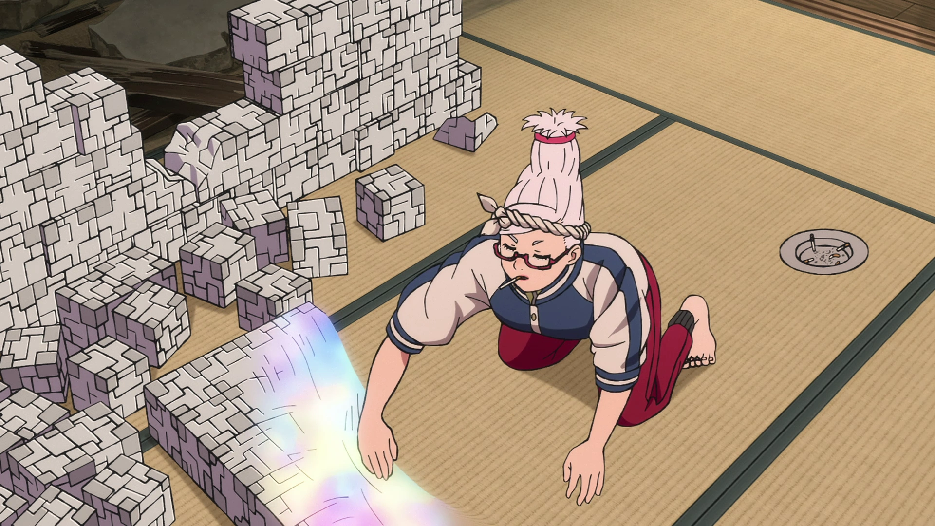 With Acrobatic Silky's powers, Aira rises up to the monster's face and pummels it by slinging a car into it with her hair, stunning it. Momo compliments Aira while she rides on Okarun's back, but the leader insists to be called as such and demands her to aim for its legs so they can push it down. Momo refuses to call her like that but she still does as she's told, throwing another car with her psychokinesis. The kaiju is unphased and it thrusts its leg forward, which Okarun manages to evade. Momo keeps screaming, frightened by the monster, prompting Aira to make fun of her for not calling her leader. This small distraction turns to be almost fatal when the kaiju smashes its arms into the building she's flying on top of, launching Aira into the storm of debris.