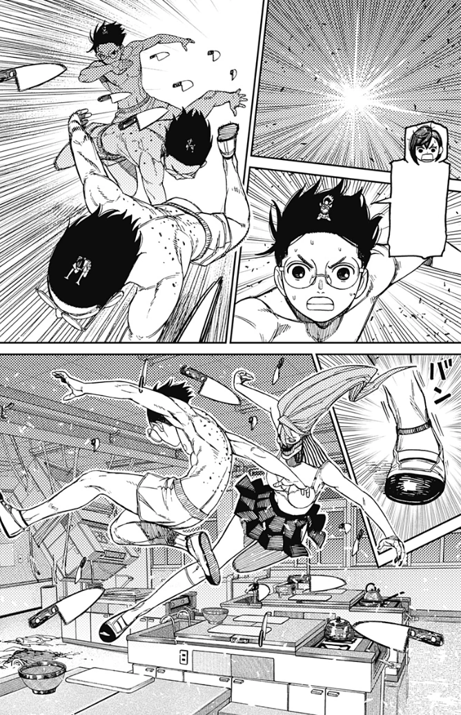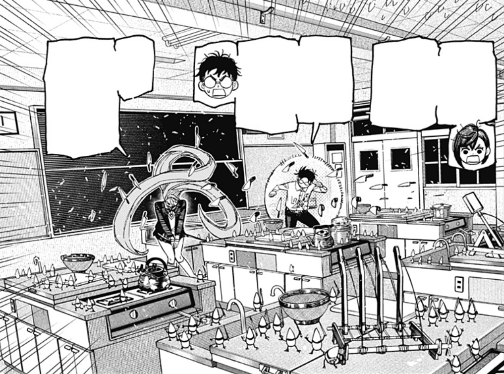 Okarun asks Momo what's troubling her, making her panic as the entire classroom is filled to the brim with pygmies, who are preparing to attack them with catapults, ropes, bows and arrows. They bombard the humans with moree knives, forcing Aira to use her hair as a shield while Momo envelops Okarun with her powers to defend him. More pygmies climb onto the boy and Momo tries to warn him as she punches the ones around her, although he also cannot perceive them. The girl understands that only she can see them and by affirming that they are everywhere, Aira decides to pick up two cooking counters wrapped around with her hair, planning to destroy the room and kill them with collateral damage. Upon trying to launch them, she shockingly realizes that she cannot move them as her curls have been tied to the walls and ceiling by the pygmies. Some creatures hop onto the cookers and turn them on, heating the hair up and sending it on fire. The blazing cloud races back to Aira's head and she tries to unravel the strands in vain. Thankfully, Okarun quickly grabs a knife and chops her hair, preventing the fire from spreading further. He apologizes but Aira reassures him that he saved her and Momo hands her another knife so she can cut all the strands that are leaving her immobilized. She also warns them that there's gas buildup in the room and if they are not careful it could explode so she opts to dissipate all the flames in the room. Just then another set of knives is hurled their way and they are all forced on the defensive once again, acknowledging how dangerous the battle has become. Okarun demands to know how many enemies are there and Momo shouts that there's atleast a million of them, and defeating them all is impossible.