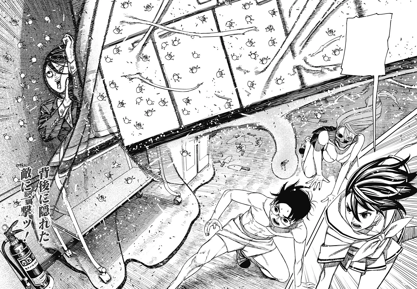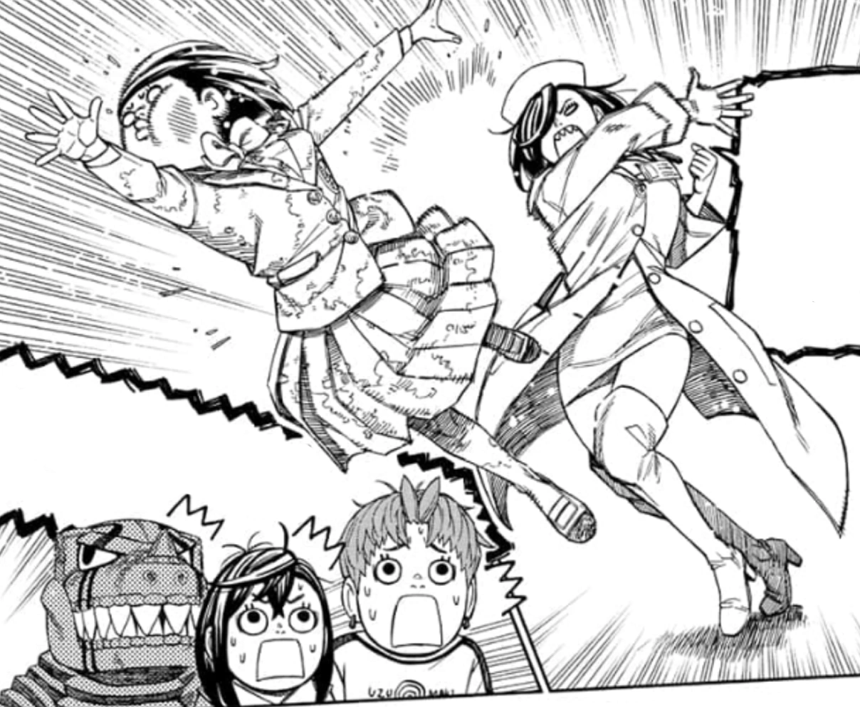 Aira too alerts that she has been stitched to the pavement as the pygmy army slowly advances with their war machines, preparing to send volleys of knives, arrows and burn them alive with the cookers. Despite being trapped into a corner, the creatures mysteriously do not attack. Momo realizes that Koki is hiding right behind them and confirms it by finally finding her aura. She taunts the pygmies for not being able to start the assault without hurting their master as she uses her psychokinesis to hurl an entire cooking counter at Koki, catapulting away the enemies and crushing the girl against the wall. She points out to her friends that she had been cowardly hiding behind a curtain knitted by the pygmies despite being the one who started the conflict, although Okarun is more distraught about the fire from the cooker setting the curtain ablaze. Momo grabs a nearby fire extinguisher and engulfs the area with foam before charging at the tiny adversaries and kicking them away as they retreat, declaring her victory. Surprisingly, the pygmies undo the stitches from Okarun and Aira, waving the white flag. In the meantime Aira touches Okarun's naked back, flustering him and enraging Momo. This small distraction allows the creatures to sneak back and carry Koki away, so upon noticing they start chasing after them and Aira deploys her hair to immobilize her. She thinks it's going to be easy since she can see her, but the creatures move erratically as a single form, dashing around the room and preventing Aira from wrapping her hair around Koki. Momo is perplexed since Koki is knocked out and they are still moving on their own, theorizing that they are willingly helping her out. The creatures hop onto Okarun and Aira to repeatedly tickle them and prevent them from getting up. Momo uses her power to slap the pygmies away and she lastly blocks the classroom's door to prevent Koki from escaping, although they smartly utilize the windows above to pass through, fleeing from the battlefield.
