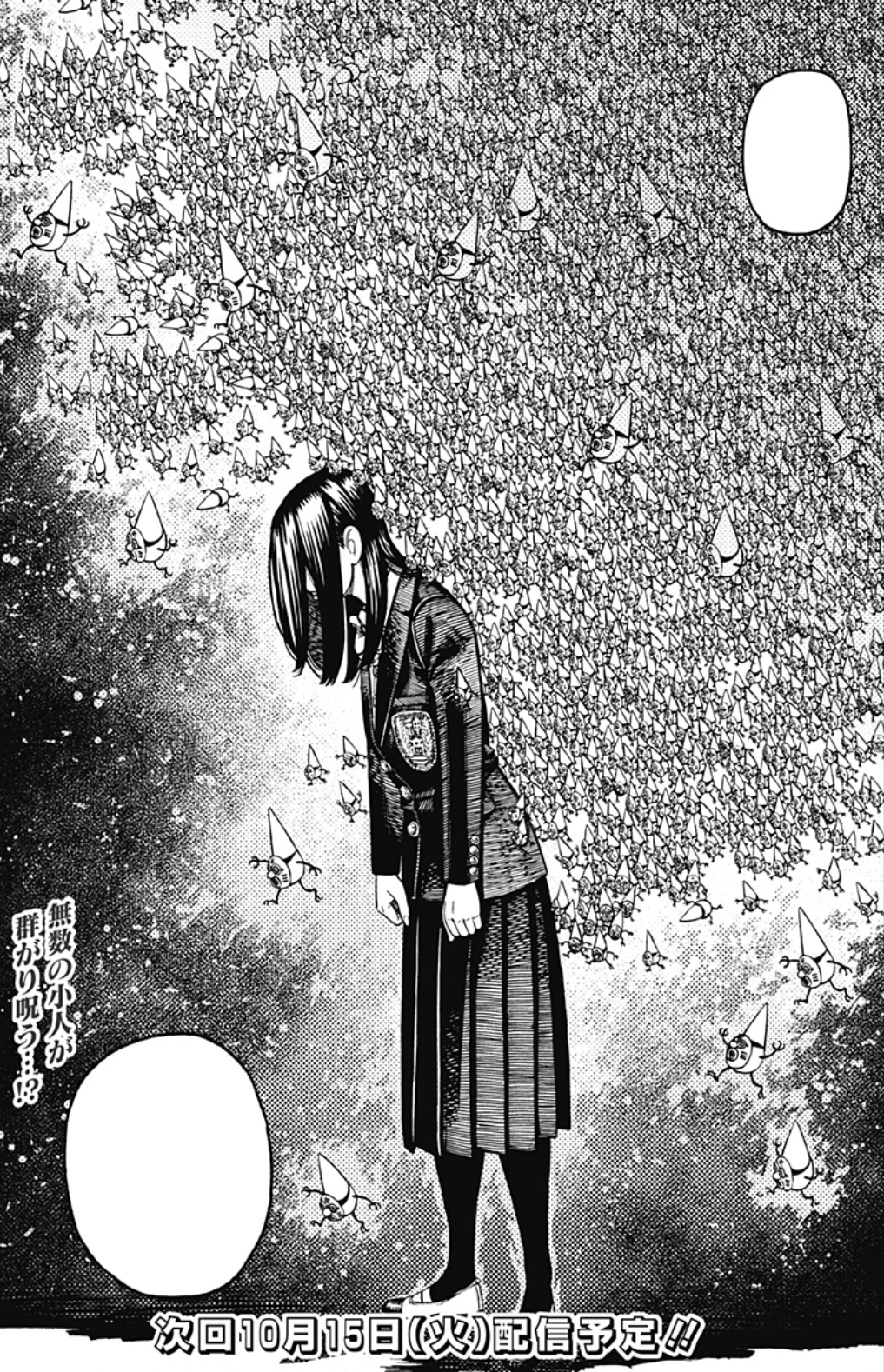 Jiji, Kinta and Bamora are still patiently waiting outside but they understand that they need to something since break time is about to end. Jiji remembers Bamora activating Empty Space when they first fought and requests her to do it once again. The girl agrees and turns on the setting Heart-Pounding hidden mode, transporting them in the pocket dimension just as Koki is dragged away by the pygmies on the ceiling, confusing the trio. Momo, Aira and Okarun then breach the door and bash into Jiji and Kinta, leaving them stunned. Okarun and Aira are still being tickled by the creatures however Momo redirects the boys' attention to Koki and a second chase begins while the former two remain behind. Because of the pygmies' speed they slowly gain more distance, so Kinta masterfully deploys his nanoskin hoverboard, gliding through the hallway and keeping up with their pace. Before he can catch her, he's struck in the face by the nurse Queen's baton, launching him off the vehicle and leaving him unconscious. The others soon arrive but Koki begins to lie, stating to Queen that they were the ones who attacked her first. Jiji and Bamora try to convince the nurse but she doesn't tolerate bullying and so the tension keeps rising up. Queen then talks to Koki, revealing that she had bigger numbers on her side thanks to the pygmies who she can surprisingly perceive unlike everybody else. Koki spills the truth and after the nurse slaps her, they recover inside the infirmary where the girl tells them about her condition, ultimately joining their group to identify her blackmailer.