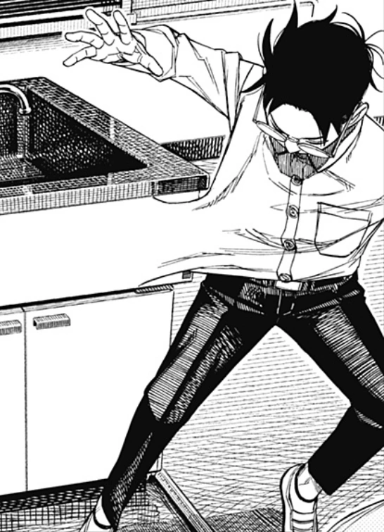 Aira tries to open the door but soon gives up as she realizes that it must be an alien's doing due to the empty space they are trapped in. Okarun is confused to why he could still enter it since he doesn't have Turbo Granny's powers anymore, when his shirt is suddenly merged to the cooking counter next to him. Aira manifests her Acrobatic Silky form and tells the boy to stand behind her, but Okarun's jeans suddenly attach to Aira's skirt. They try to disjoint their clothing but Momo shouts to keep their guard up, which is proven as a wise choice when from the other side of the room a storm of knives is flung their way. Momo warns the duo and she uses her psychokinesis to block most while Aira kicks away the remaining cutlery with her acrobatic speed. Aira positions herself over Okarun to protect him and she thanks Momo for her help, who's currently residing in her shirt pocket. Once again however, Aira and Okarun's clothes are merged in an unfortunate position, making Aira blush and conclude that they must be engaged. The small Momo pummels the girl with tiny punches to have her stop and she notices that in the point where they are connected, there's a group of Pygmies who are stitching their uniforms together at an incredible speed. She lunges down on them and sends the creatures flying before she deploys her psychokinesis to grab a pair of knives to lacerate their shirts' tissue, freeing them. Momo then warns Aira that the tiny enemies have clung onto her shoulder, but despite her brushing it down, she doesn't see them nor feel them.