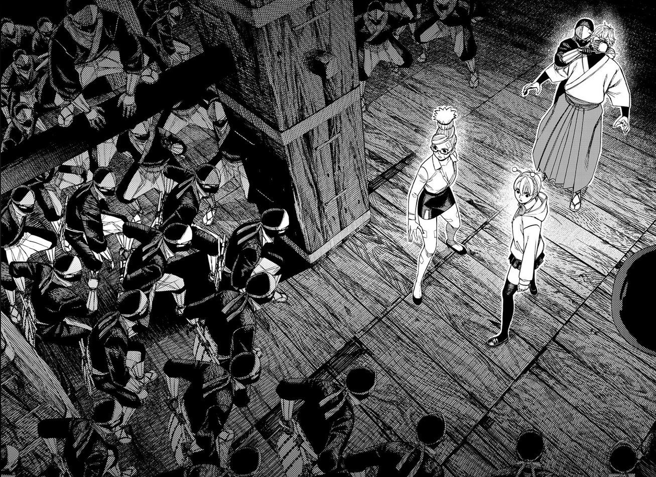 Upon the group's arrival, Seiko falls for Enenra's trick and hastily takes a taxi to Matsue Castle with Momo, Jiji, Bamora, the Evil Eye, and the pseudo-priest, leaving Unji, Daiki, and Raiya behind at the shrine. There, they find themselves encircled by a group of ninjas, with the pseudo-priest being held captive by one of them. After the ninja demands their surrender in exchange for their freedom, Seiko realizes Enenra's deception, instructs Momo and Bamora to return to Izumo Taisha quickly to lift Momo's curse, and urges the pseudo-priest to disclose his true identity.