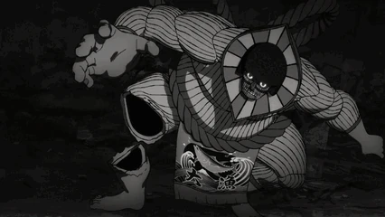 Momo rushes Okarun to flee in the other direction, but when they turn around, they are met with a huge concrete wall. At the same time, Momo and Okarun start bleeding from their nose, determining that it's being caused by the black mist being released in the air. Momo spots the torii gate in the fog and wants to put back the talisman, but Okarun stops her as the torii is blocked by the wall, meaning he would combust with no chance to escape. Suddenly, a huge thud is heard after something drops from the ceiling, revealing itself as a giant creature who calls them bad people for breaking their promise, urging them to hand over their organs. As he says this, he stomps his foot on the ground, sending a shockwave that forces the duo to run for their lives.