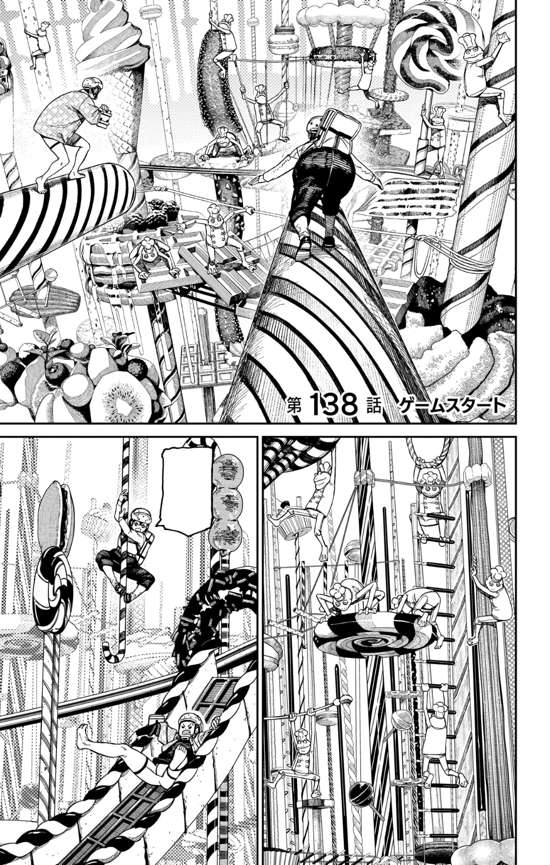 Unji spots it above a macaron in a section below them a little distant from them, so they argue whether or not they should go after it. Unji explains that they should wait for the next round of candy tag because messing up even once would sign their fate, although Momo reasons that the frogs will get it first if they don't hurry. The two stare at each other and take a gamble, dropping from the donut and traversing what remains of the candy obstacle course. Sadly the Death Pâtissier chooses a cake instead of a macaron, meaning that they now have to change plans and delay their chase. Unji displays courage and continues running after the ball, ordering Momo to get to safety. Suddenly, two shikigami hurl two big treats his way when Momo sacrifices herself and drops behind him, taking the hit instead. She plummets onto a caramel roll and manages to stop her fall and screams at Unji to keep going. The boy races against one frog and although the enemy arrives first, Unji dives onto him and launches him out of the way, obtaining the family jewel. As the time drops to zero, the giant chef charges up his rolling pin to crush Unji, prompting him to activate his spiritual power. He's shocked upon discovering that he can't manifest the umbrellas entirely because he had recently used both of them to obliterate the Dark Knight. He warns Momo and starts running just as the Death Pâtissier demolishes the platforms he stands on, catapulting him downwards. He manages to grip onto a sugar cane extending from a tower, although because it's not cake he's still going to be targeted.
