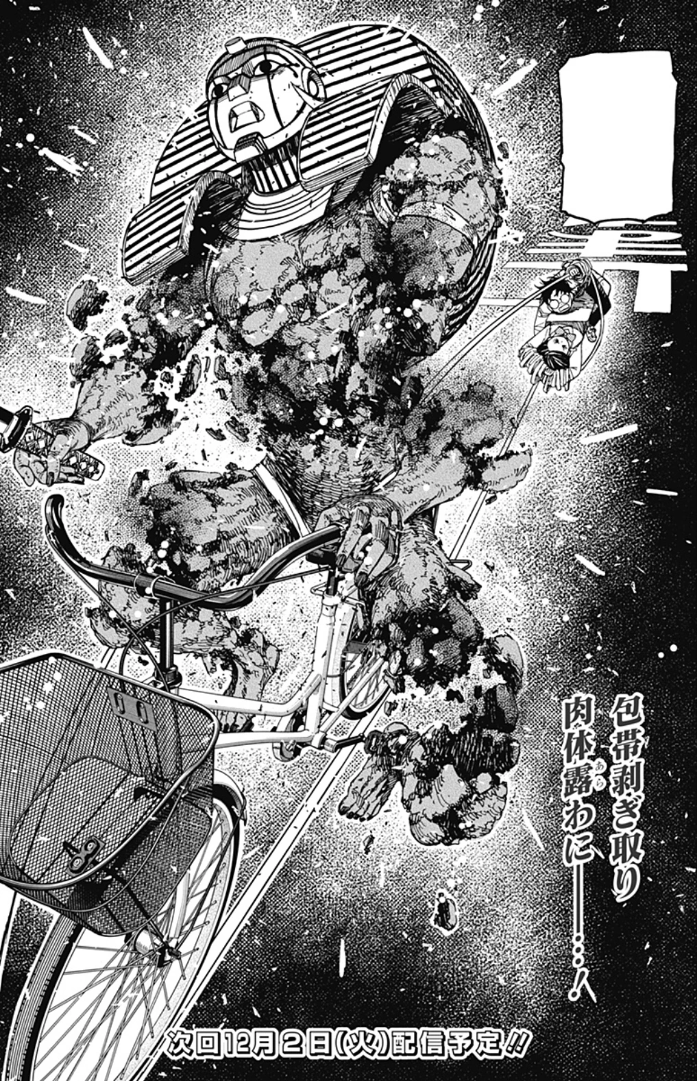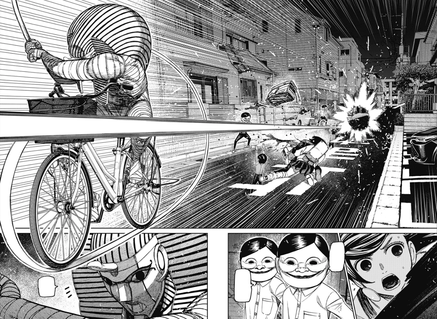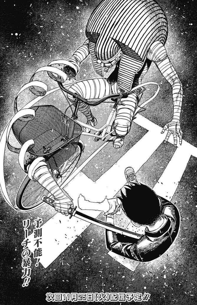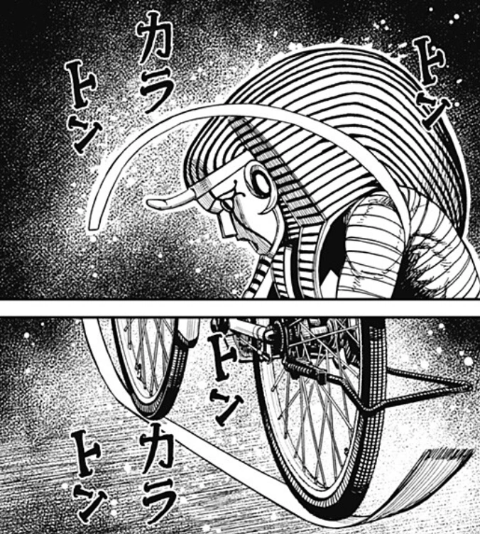 Okarun falls down and Mr. Dris charges the katana at his neck when out of nowhere a traffic cone crashes into him, thrown by Momo. He cycles away and gains enough distance to accelerate, returning only to throw a couple of swings which Okarun deviates. He again distances himself from the duo before charging at them, though this time, the Oni Club amped by Momo's ki increases drastically in size and Okarun swings it at the alien, severing his vessel in half. The upper half is sent flying but Mr. Dris manages to reattach himself with the bandages and changes his strategy, deciding to not just erase the street they are standing on, but the entire neighborhood. Momo and Okarun are left stranded in the middle of darkness while Mr. Dris rides his bicycle at an astounding speed around them, hiding his position. All of a sudden everything turns quiet and the noise of the bike's pedals are heard behind the duo, compelling Okarun to turn around and parry the attack with his giant Oni Club. As Mr. Dris cycles back into the dark Okarun swings the talisman wildly in fear, prompting Momo to ask him to shut the Oni Club off since the light is giving away their position. Mr. Dris returns nonetheless and swings his katana at them, though Okarun is still able to block him and forces him to retreat again. The duo determines that he's using echolocation to perceive them, corresponding to the "Ton Kara Ton" noise he constantly emits. With this information, Momo has the genius idea to form a fake body with their backpack and clothes as they hide beneath the road mark, holding on to their life. Mr. Dris falls to this trap and slices the decoy, allowing Momo to take a hold of the bandage under the bicycle. Okarun climbs back up to hold her and together they start unraveling the bandages of the mummy, whose body decomposes and falls apart upon exposure to the air.