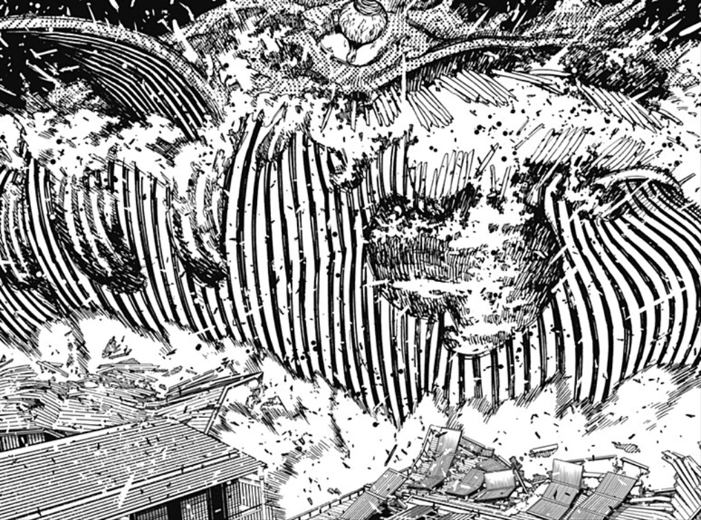 With his vessel broken, Mr. Dris opts to break out of the death mask and slithers out, revealing his true form as a massive blue space whale, floating over the city. Because he's no longer utilizing the mummy, his abilities deactivate so the road and the neighborhood reappear. Momo and Okarun panic as they notice that the gigantic alien is plummeting towards them and the bandages wrapped around them prevents them from moving. As a last ditch effort, Okarun collaborates with Momo to unleash a last, massive upwards slash to create a hole in the whale, who seems unaffected and razes the city ground, destroying the area. Two Serpo notice his action and mock his foolishness since they had told him that if he left the human vessel, he would get crushed by Earth's gravity. As they escape, their comment reveals to be true and Mr. Dris inflates with gases before blowing apart, sending chunks of meat flying into the surrounding buildings in a disgusting finale, leading to the closure of Empty Space.