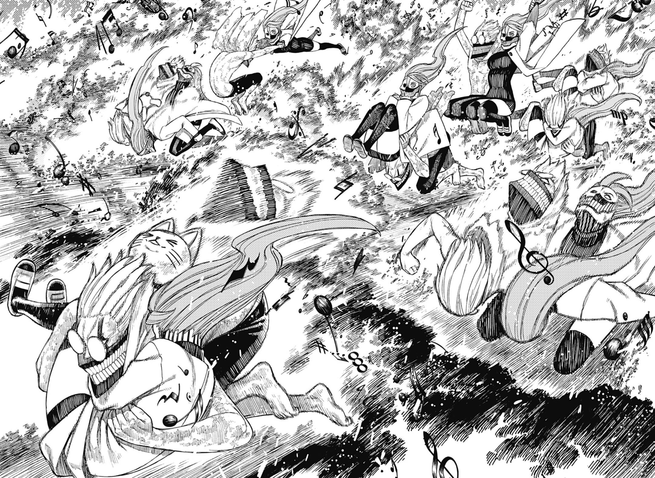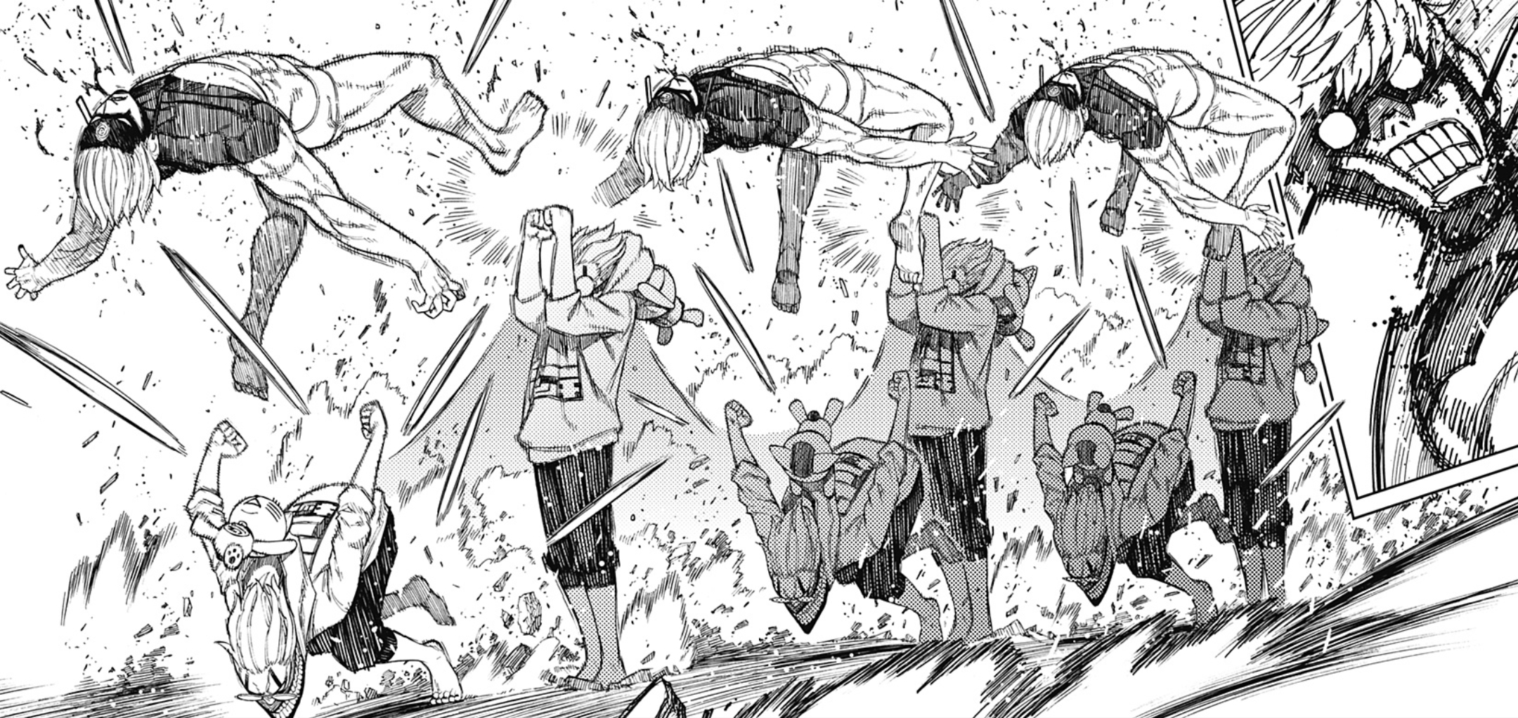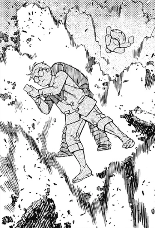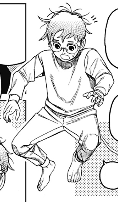 Okarun attacking the Evil Eye in a repeated succession. Okarun used this power in combat or to put some distance between himself and his enemies. When engaging foes in close combat, Okarun relied on his speed to make swift physical attacks that gave his opponent no window of opportunity to counter, with his attacks taking the form of a series of squats and headbutts. When partnered with his allies, Okarun could use his speed to quickly jump in and move them out of the way of incoming attacks, or carry them on his back to either catch up with a target on the move or make a necessary escape. After receiving training from Turbo Granny herself to properly harness her power, Okarun managed to improve his combat rhythm. This was shown in his battle against the Music Room Portraits, where he effectively used his enhanced speed and reflexes to evade the tulpas' barrage of explosive musical notes by recalling the rhythm of the hayashi music and defeating them with a succession of five headbutts at once, so fast that he left afterimages. Later, he was capable of dodging the Evil Eye's multiple grudge ball attacks, whereas he had previously struggled to dodge even one in his first fight with the yokai. Okarun launching himself at Acrobatic Silky. Since All-Out came from the boost in leg strength, Okarun was able to launch himself with great force like a missile, which was his preferred method of attack. The charging speed was great enough to have Okarun get through a crowd of possessed citizens and send Acrobatic Silky, a large body yokai, crashing back and left badly injured to stand up for a short amount of time. Most incredibly, Okarun was able to split the giant body of the Serpo Dover Demon Nessie in half. While running from the Earthbound Spirit Crab, Okarun was also shown capable of using All-Out to keep himself and Momo afloat in the air long enough to land on city ground by having his legs rotate around his body like a helicopter’s rotary wings. | ||