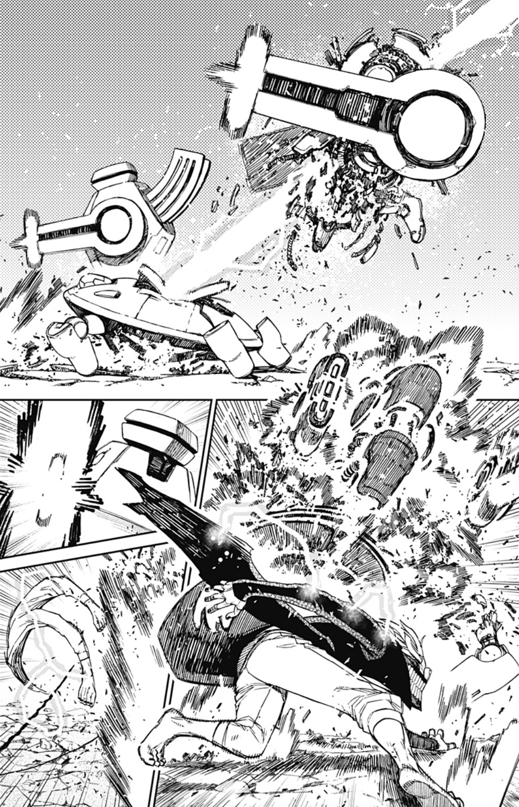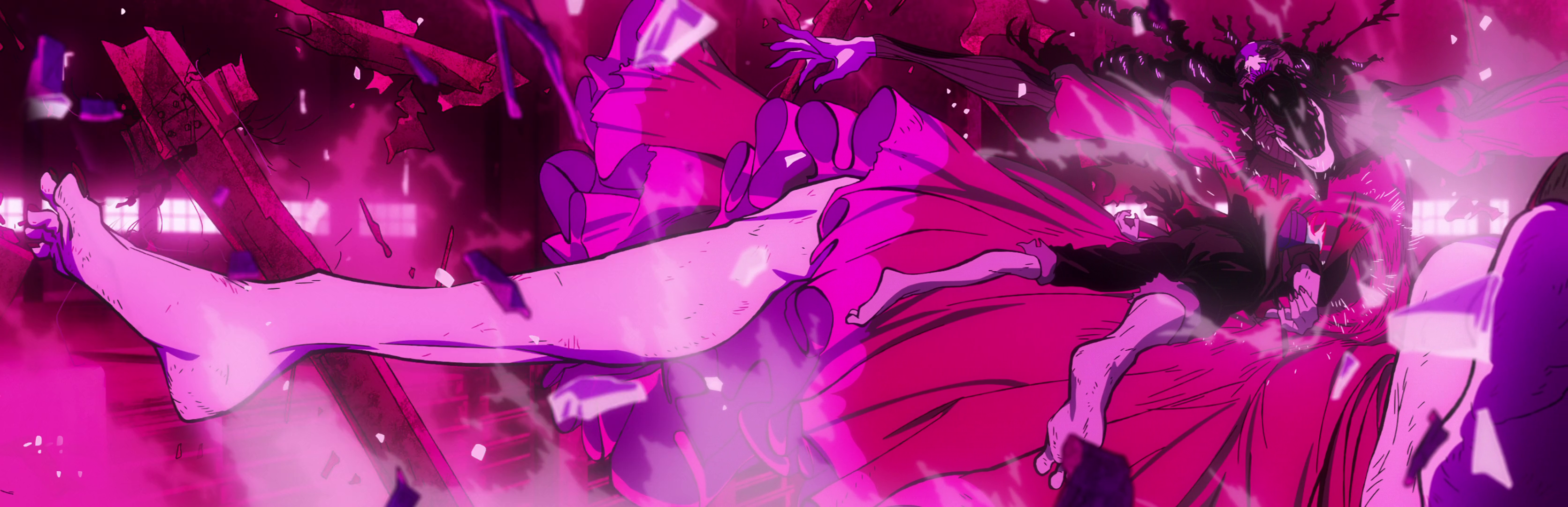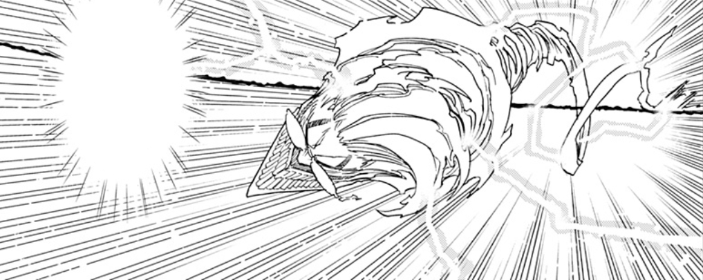 Okarun instantly takes down a few Kur from ejecting out of a telephone wire. Okarun was able to apply his telephone line transportation ability in battle. By continuing to be on the run after ejecting out of a telephone wire, Okarun’s immense speed became augmented, allowing him to attack his foes in the blink of an eye. During the battle against the Kur, he was able to instantly take down multiple enemies before any one of them could react to his series of collisions. Using an All-Out that had been amplified by this speed, Okarun was able to completely destroy the spatial suit alien with a single collision before he could attack Momo. | ||