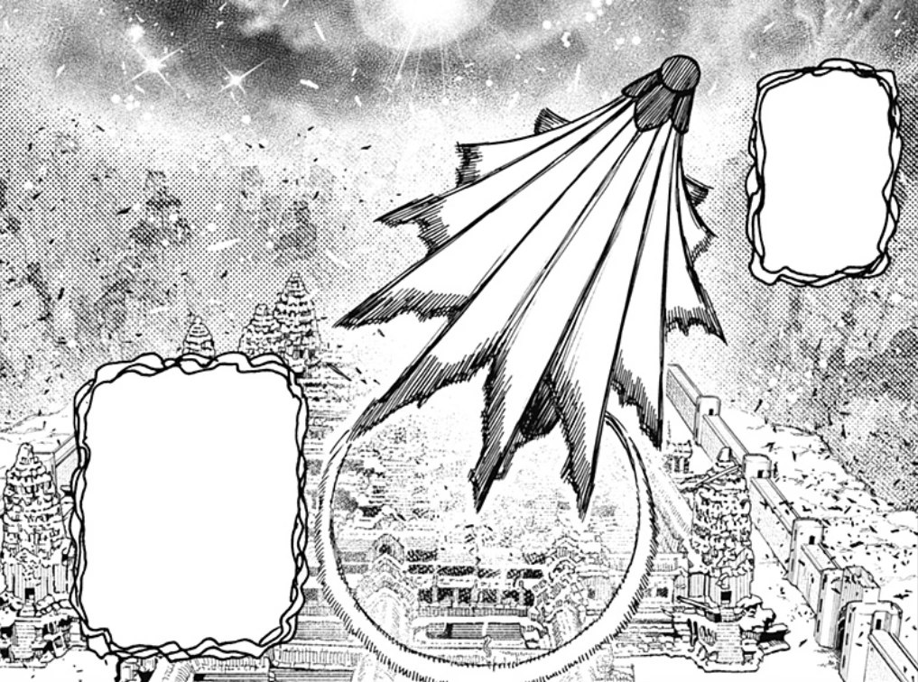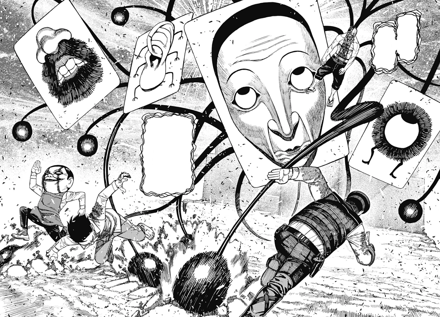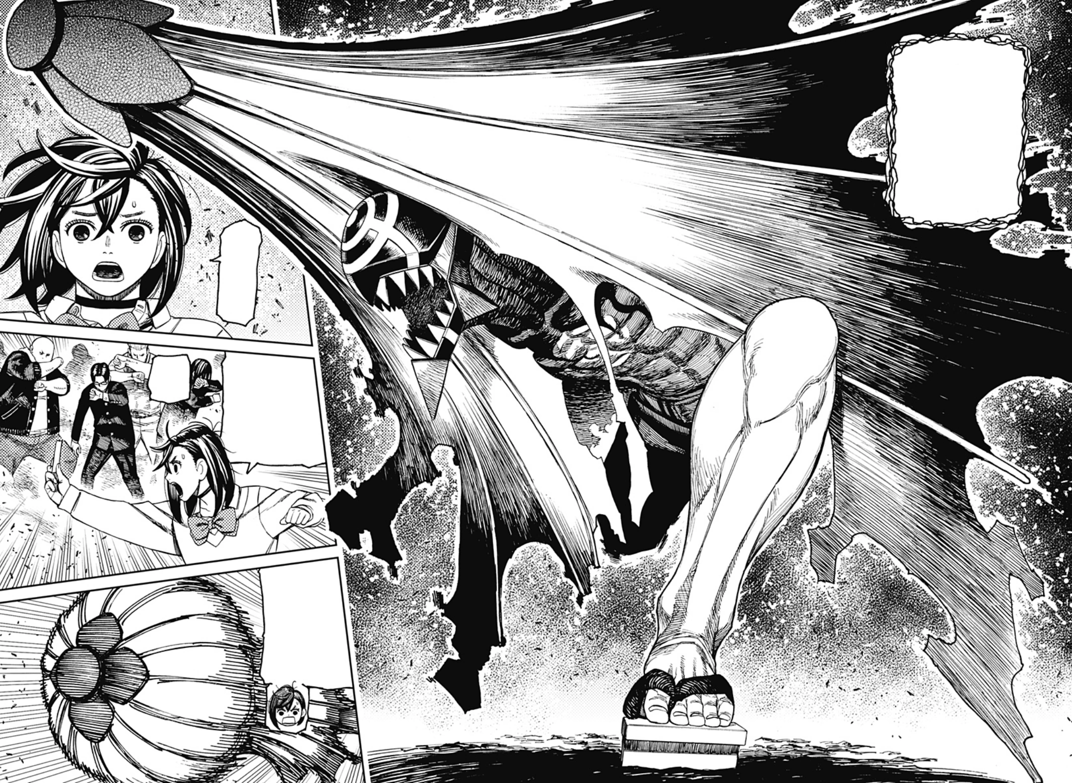 Okarun observes his tremendous aerial speed and even Turbo Granny admits that although Umbrella Boy is a sweet yokai by nature, he's truly unstoppable in a fight. As she says this, the yokai unleashes three consecutive shockwave beams, cracking the terrain and sending Rokuro and Vega flying backwards, preoccupying the boy. Turbo Granny keeps patching up the cuts on Momo's body as she explains to Okarun that those two don't stand a chance and he must retrieve his family jewel to manifest his powers if he wants to win. Okarun wonders if such a task is possible in his human form but Turbo Granny orders him to think of something and she leaves the area to contact Rin, remarking that he's the only person who can actually defeat him. The boy runs to the fort and lays Momo down, determined to take down the yokai. He runs back into the fight though he can't help but notice how slow he is and how much he has depended on Turbo Granny's abilities in his fights. He admits that he's terrified to face such a calamity, trying to figure out a way to reobtain his kintama even with the odds stacked against them. He suddenly remembers Momo blasting Hastur away and realizes that she always turned the tides of battle no matter how dire the situation was, prompting him to devise a plan just like hers. In the meantime, Vega shouts at Rokuro that he's out of bullets and he must do something. The latter explains that his means of movement and attacking are obtained from the shock waves generated by air resistance everytime he closes and opens his umbrella, meaning that they could stop him if they got rid of all the air although Vega is baffled by his nonsensical solution.