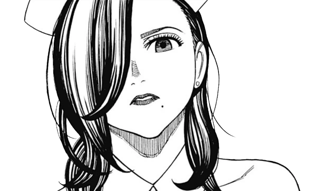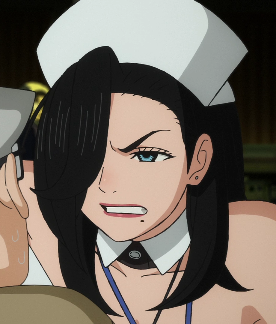 Queen is a woman with shoulder-length black hair, with a bang that covers the right side of her face, blue eyes, and a beauty mark located under the left side of her mouth. She also wears lipstick and an earring on her left ear. As for her attire, she wears a nurse's cap, a single buttoned-up collar, a loose lab coat that exposes her shoulders, her school I.D. around her neck, and white thigh-high boots (black in the anime).
