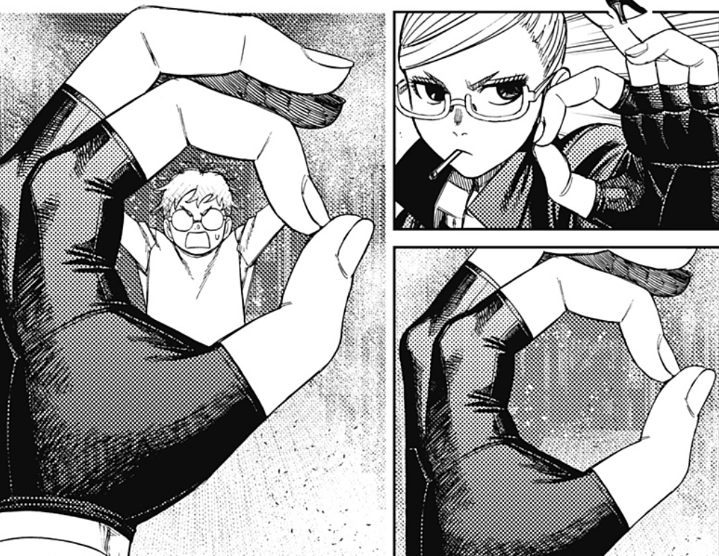 She swings her bat to clear the black mist, but because the yokai is controlling it, she gets overwhelmed and engulfed. Okarun is concerned for her safety, but Seiko pulls a talisman out of the mist which starts blazing due to the presence of the yokai. She screams out that it took her three days to be able to use the power of the god of that land, which she intends to use thanks to the multiple charm nails she scattered around the battlefield beforehand. Upon placing the talisman, the mystical barriers activate and the yokai violently explodes, exorcising it. Seiko lights up a cigarette, thanking the god of the land for their aid.