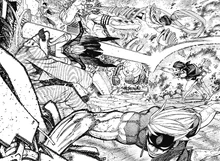 With her allies here to support her, Momo becomes ready to fight against the exosuit aliens once again. Using his teleportation line teleportation power to boost his speed, Okarun instantly takes down a few of the exosuit aliens, much to Momo's shock to see how strong he has gotten. Momo and Bamora are then saved by the Evil Eye from being attacked by an exosuit alien. Still desiring to fight Okarun, the Eye throws his large weapon towards the telephone lines to disrupt the latter's teleportation and proceeds to fight him up in combat. Their fight is soon interrupted by the Jet Booster Exosuit Alien and another exosuit alien who uses multiple arms to attack the Evil Eye. While Okarun is preoccupied fighting the Jet Booster Exosuit Alien, the Evil Eye defeats the exosuit alien punching him and proceeds to attack the other aliens as he demands for them to not get in his way. The Jet Booster Exosuit Alien receives assistant from the Space Carving Exosuit Alien as he fights Okarun, as the latter uses his suit's power to shift the position of his ally close enough to attack Okarun by surprise. Momo then throws rubble at the Jet Booster Exosuit Alien to knock him back and warns Okarun to be wary of the Space Carving Exosuit Alien's power to carve and throw space.