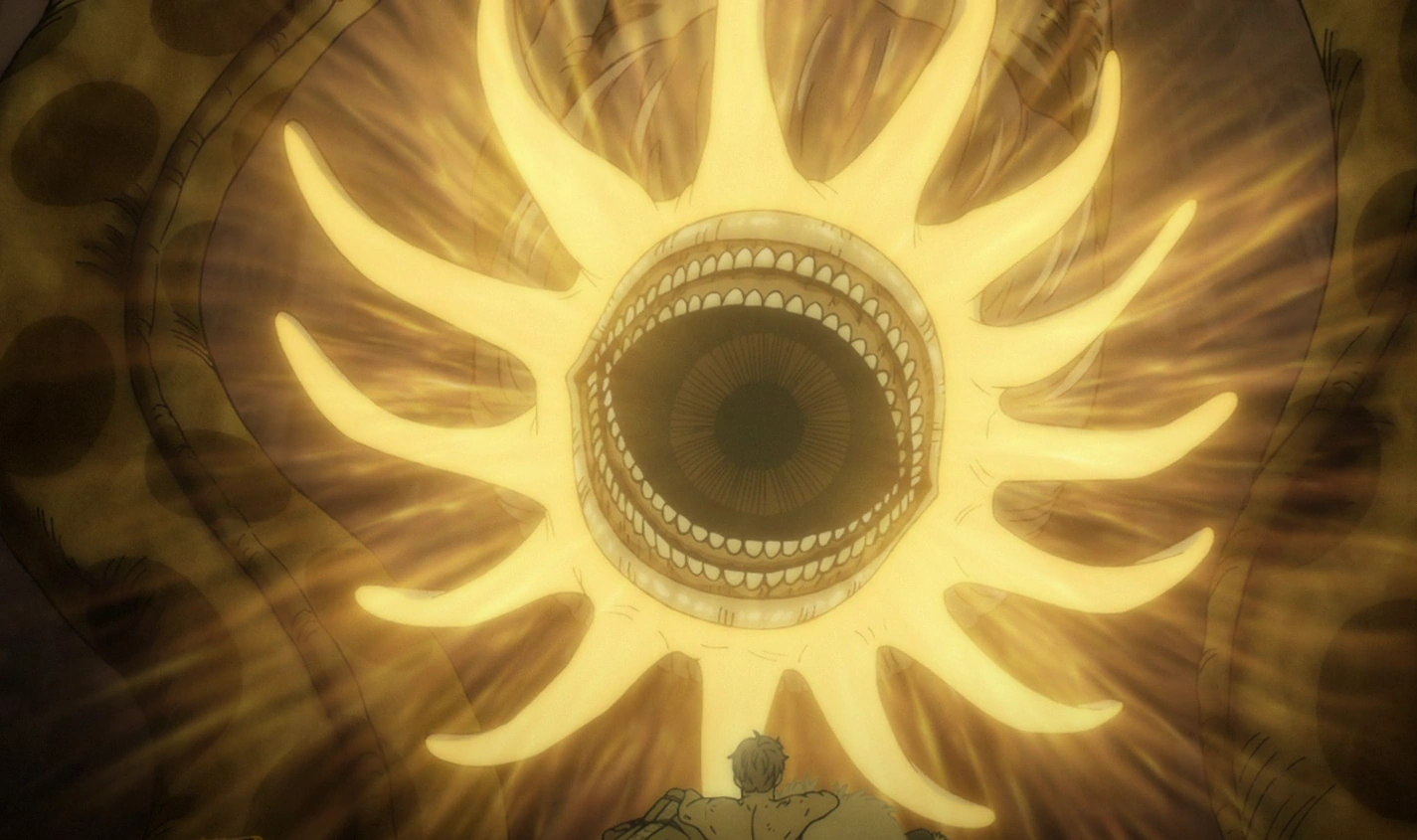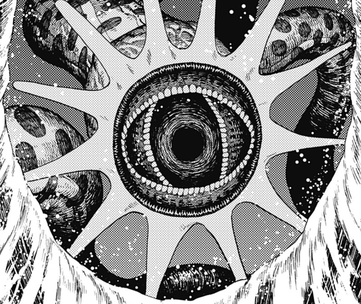 The Tsuchinoko is an enormous worm with a spotted pattern serpent body and a tentacle-ringed, gaping mouth that has multiple rows of teeth. Okarun had noted that the Tsuchinoko was much larger than the average Mongolian Death Worm, which are about 1.5 to 2 meters long in length.