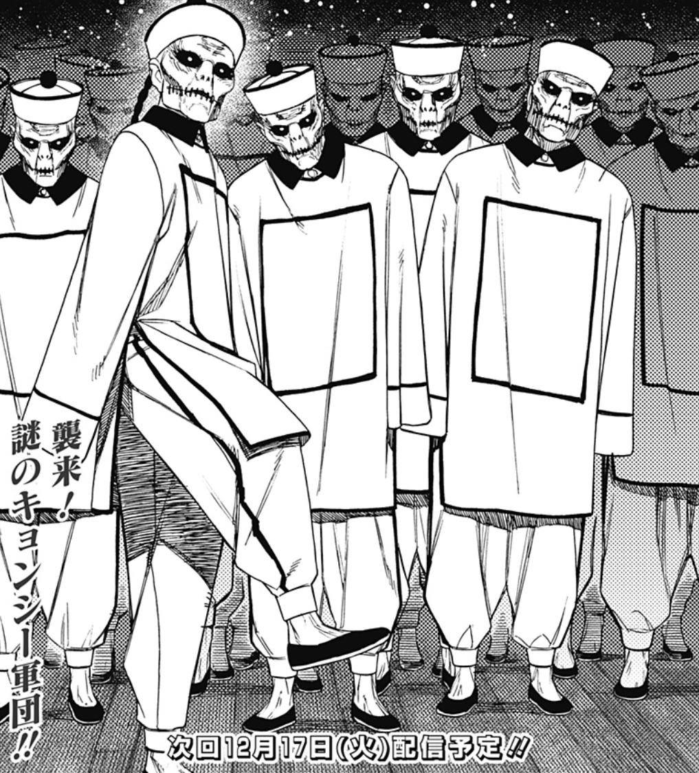 The Jiangshi (キョンシー Kyonshī?) are reanimated corpses rooted in Chinese folklore. They are all identical in physical appearance; possessing a mummified face with dark, sunken eyes, stitched mouths, an expressionless face, and hair tied into a long braid. In addition to looking identical, they all wear matching clothes, which are traditional Chinese clothes that resembles the attire of Qing Dynasty officials; a long robe with wide sleeves and a square panel on the chest, a hat with a flat top, loose-fitting pants, and dark shoes. They serve as minions to Mika Adachi who acquired the power to control them through an Asura kozuka knife given to her by an unknown individual.