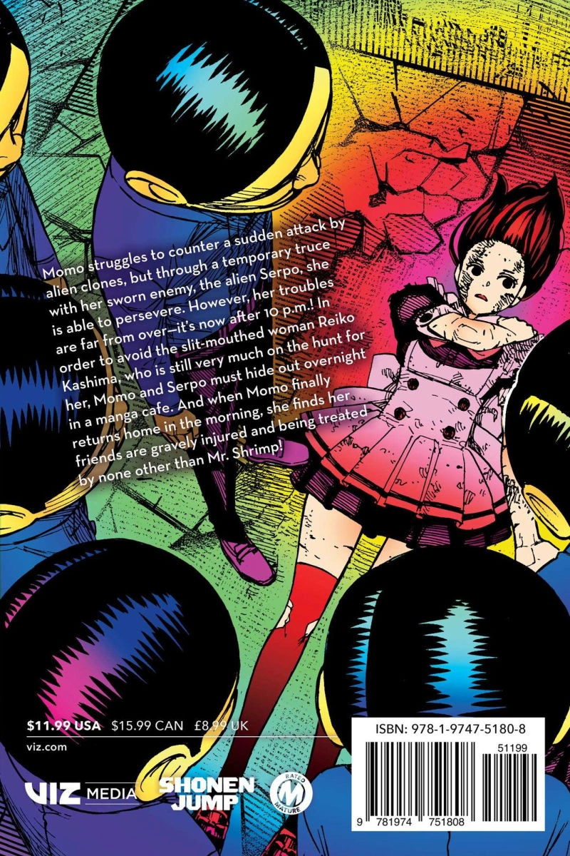Momo struggles to counter a sudden attack by alien clones, but through a temporary truce with her sworn enemy, the alien Serpo, she is able to persevere. However, her troubles are far from over — it's now after 10 p.m.! In order to avoid the slit-faced woman Reiko Kashima, who is still very much on the hunt for her, Momo and Serpo must hide out overnight in a manga cafe. And when Momo finally returns home in the morning, she finds her friends are gravely injured and being treated by none other than Mr. Shrimp!